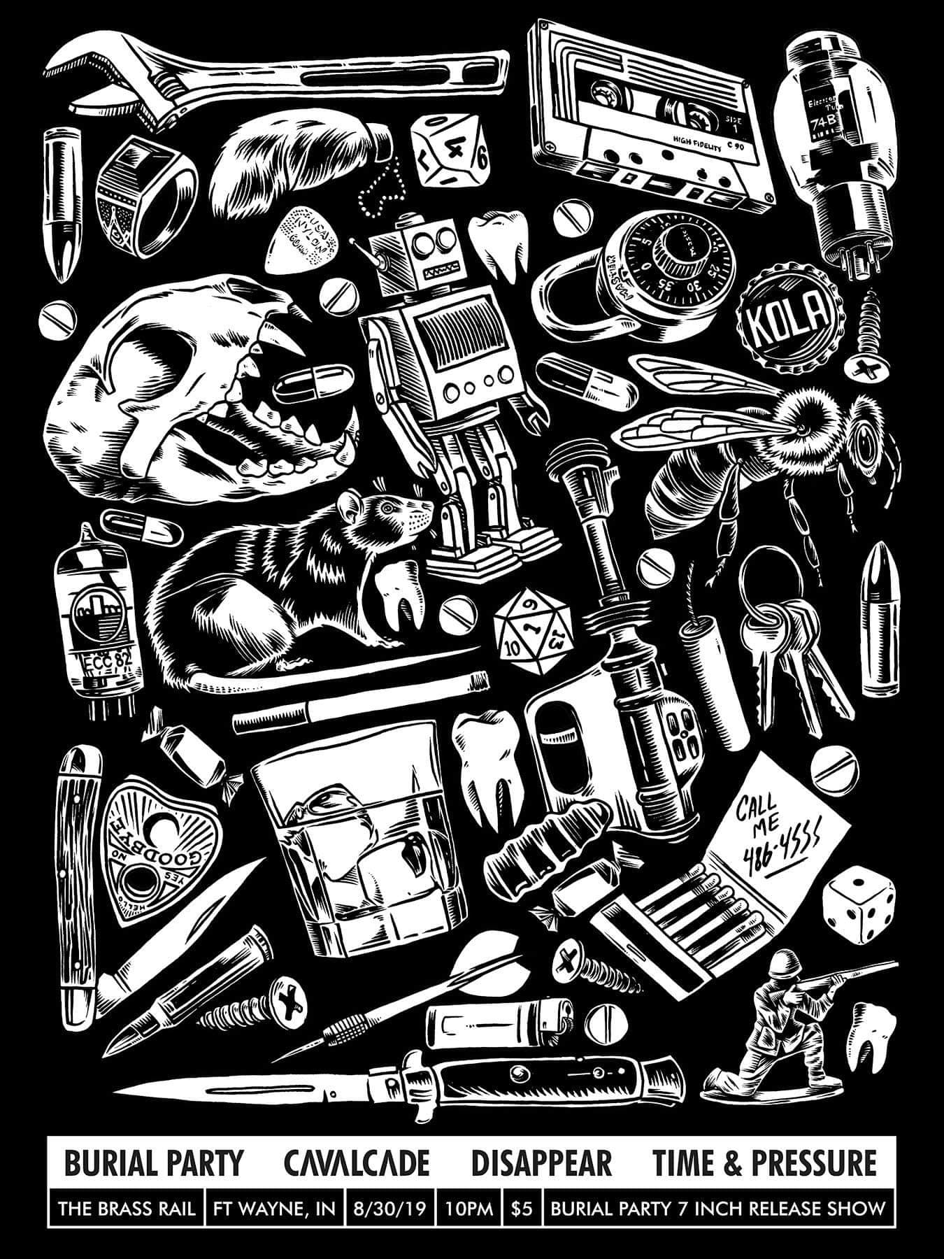 - Burial Party - Ft Wayne punk, rock, hardcore, noise, whatever... (https://burialpartyfw.com/ ) 7" record release show!!! - disappear.- Ft Wayne hardcore, punk, metal (https://disappearin.bandcamp.com/album/demo-2019 ) - Cavalcade - Lansing, MI sludge, punk, metal, psych, etc... (https://cavalcade.bandcamp.com/album/sonic-euthanasia) 10pm $5 21+